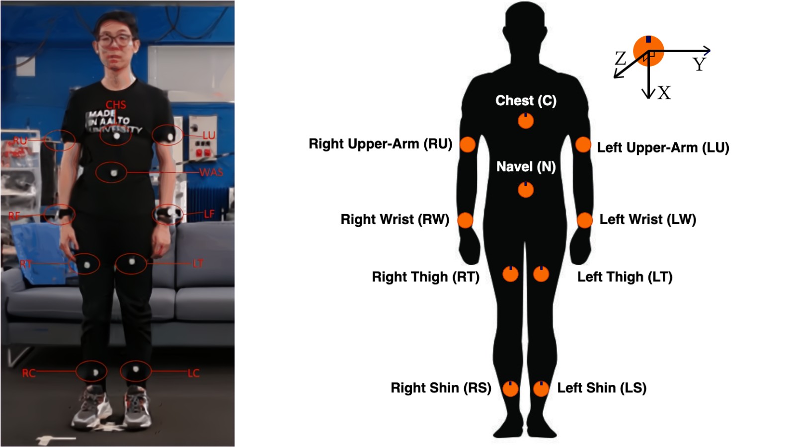 The dataset was collected using ten body-mounted Movesense HR+ sensors, strategically placed on the chest, waist, upper arms, wrists, thighs, and calves—and includes 13 common daily activities and exercises such as sit-to-stand, walking with shopping bags, climbing up and down stairs, push-ups and squats.